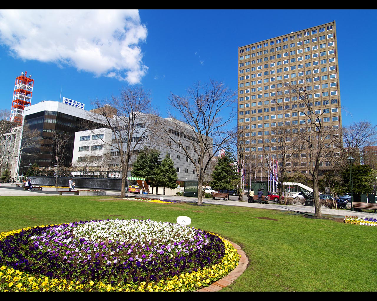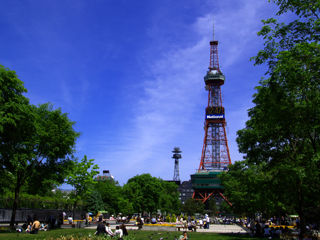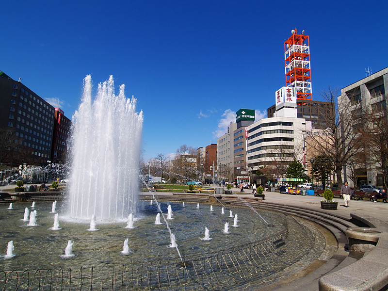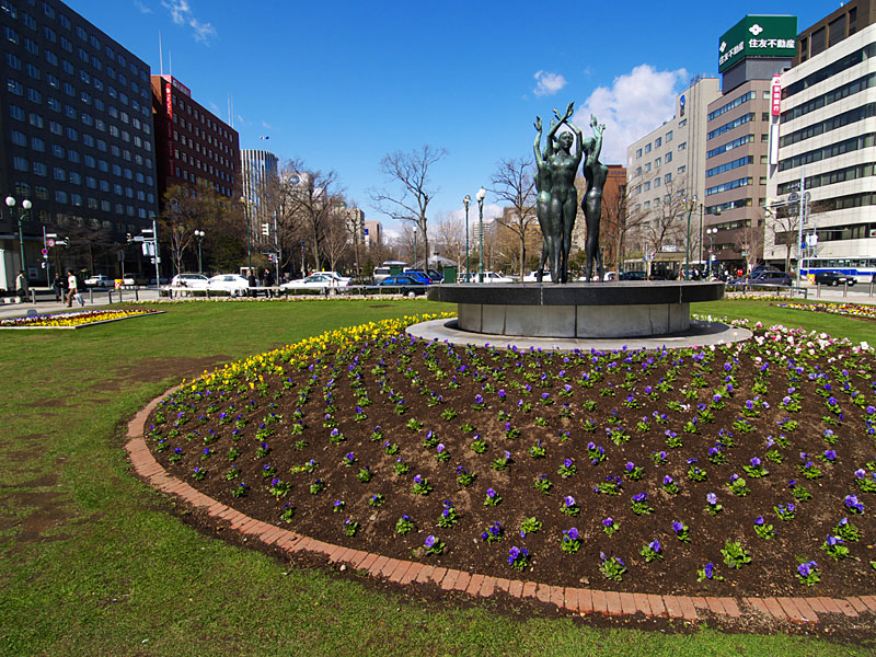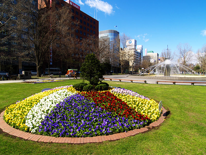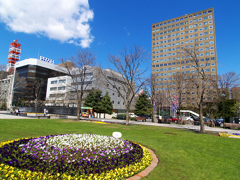 大通公園は,札幌都心中央部を横断する札幌の代名詞ともいえる公園です.都心部はこの公園を境に北と南に分けられ,北にビジネス地区,南に商業地区があります.この公園ではホワイトイルミネーションやさっぽろ雪まつりが開催され,イベントごとにも欠かせない公園となっています.また,花壇には四季折々の花々が,縁部には様々な木々が植えられ,市民の憩いの場として,特に平日の昼休みの休憩の場として活用されています.大通公園の名物として欠かせないのが露店で販売されている「とうきび」(とうもろこし)で,焦がしたしょうゆの匂いが公園に漂っています.この公園は,都市計画の上で札幌の模範となった名古屋の久屋大通を模倣したものだと言われています. |
