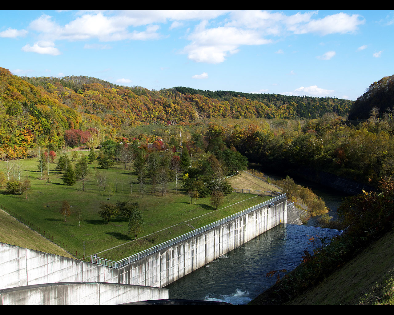 秋の桜公園と漁川ダム.春には桜でいっぱいになります.