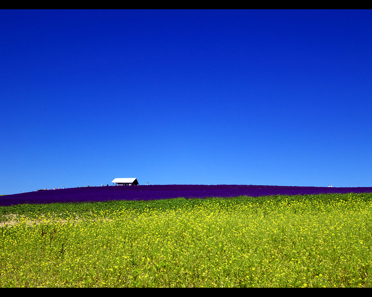 かんのファームのラベンダーの丘.紫と黄色,そして空の青がとてもきれいです.