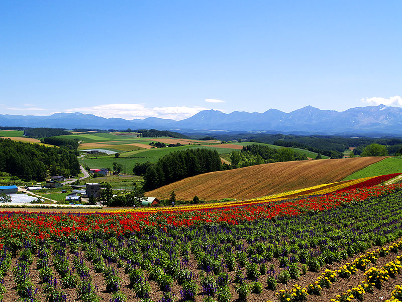 美瑛四季彩の丘とのどかな田園風景,後ろに十勝岳連峰です.