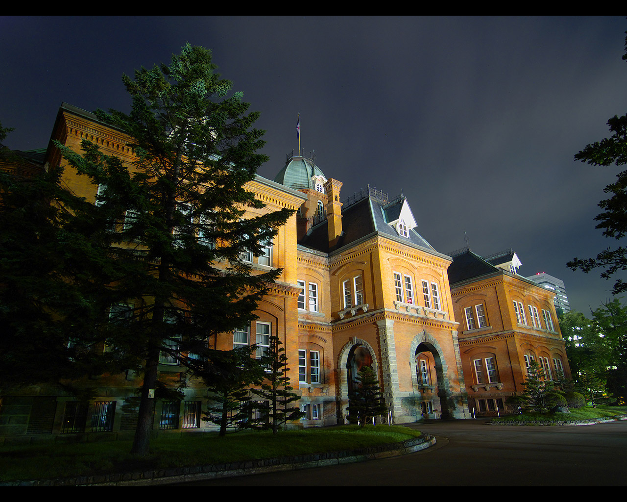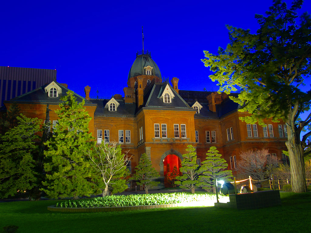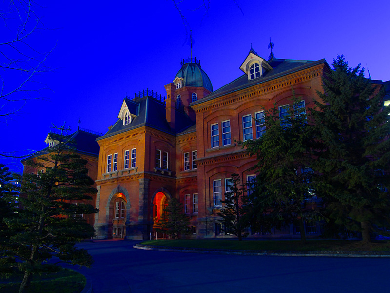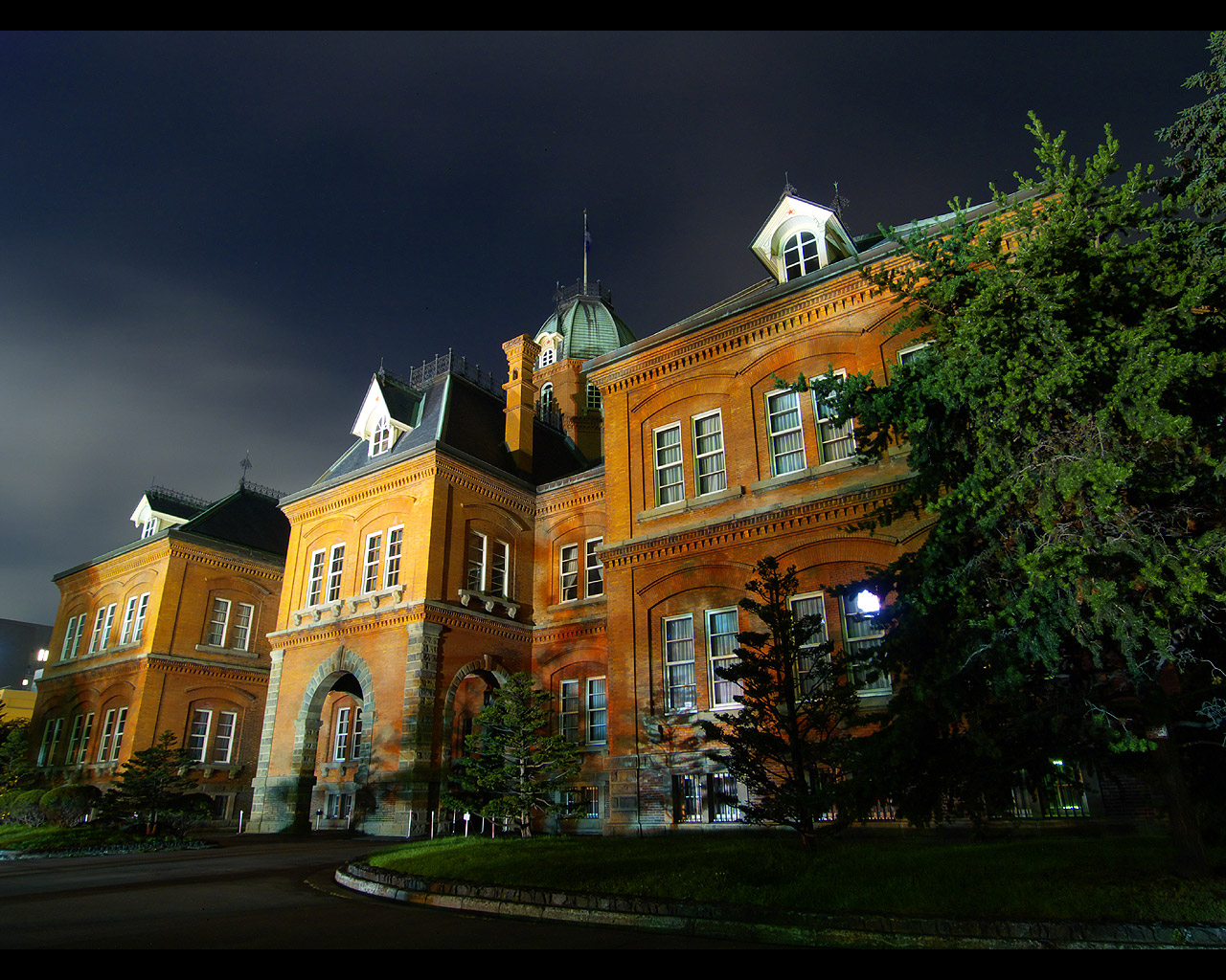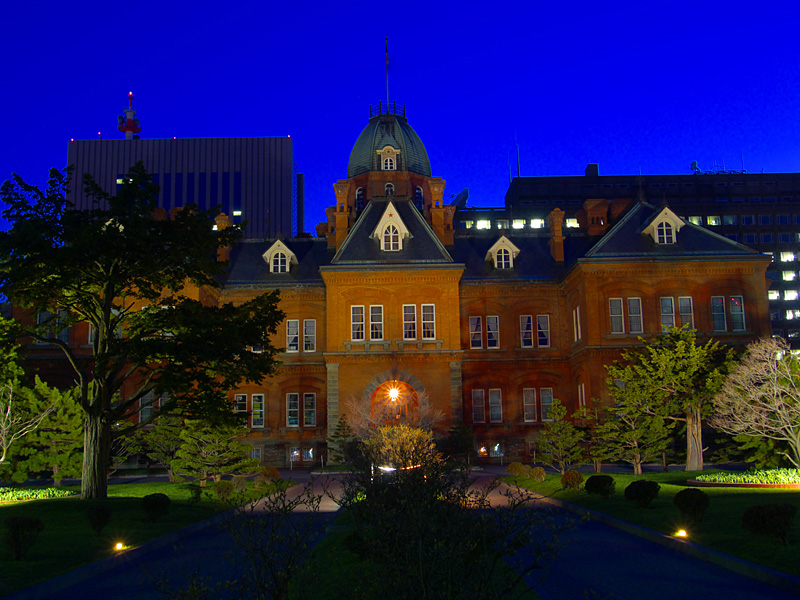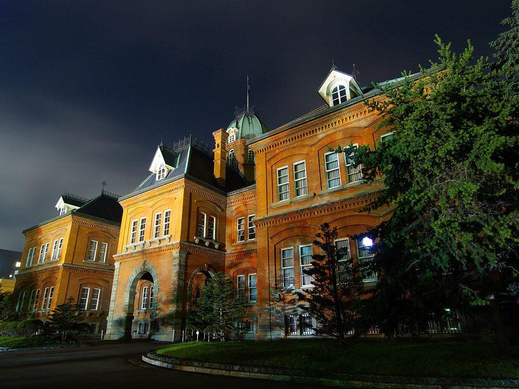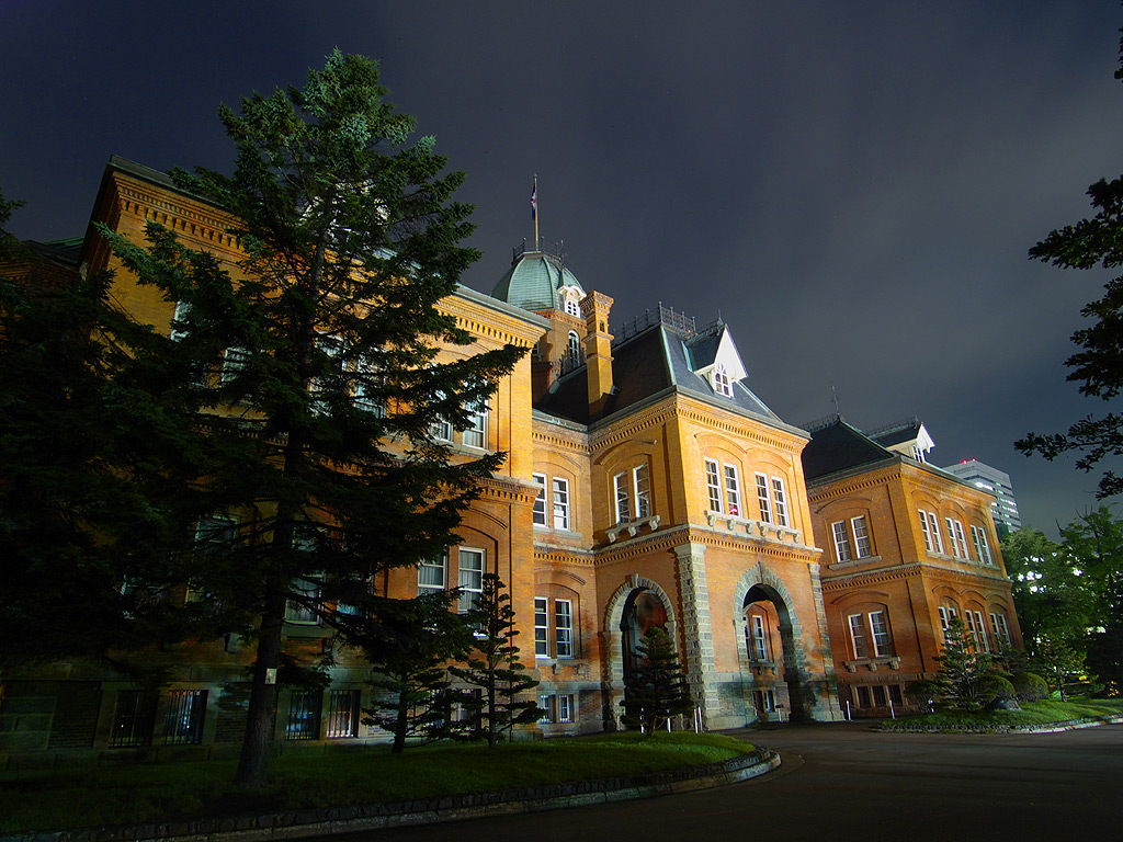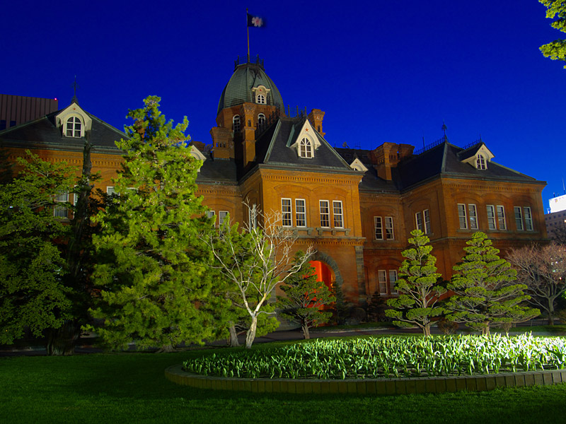 赤れんがの北海道庁は旧本庁舎で,現在は資料館や会議室として利用されています.実際の業務の大部分は裏の大きな建物で執り行われていて,赤れんが庁舎は観光名所となっています.夜景を撮るにはライトアップが大雑把なので(中央一点の光)、明暗差が大きくなってそれほど撮りやすい被写体とは言えないと思います.