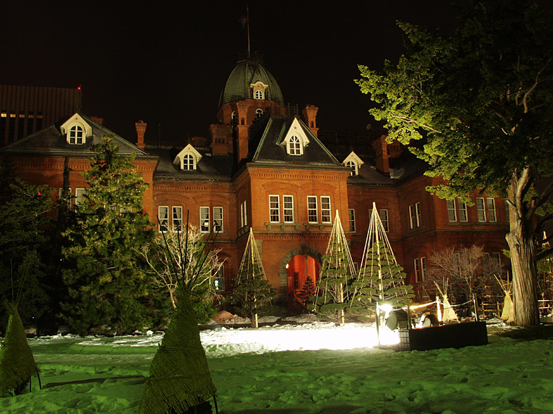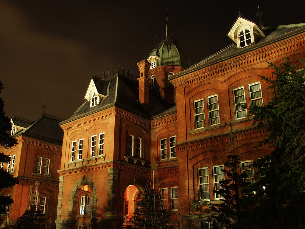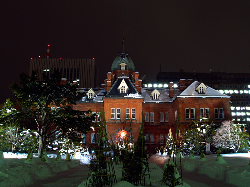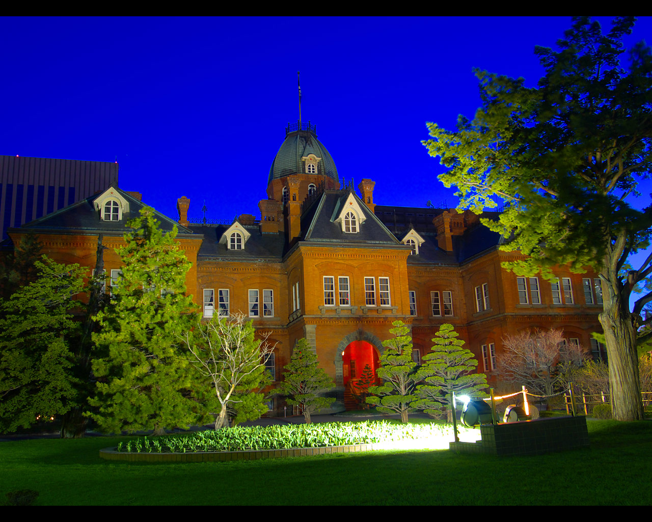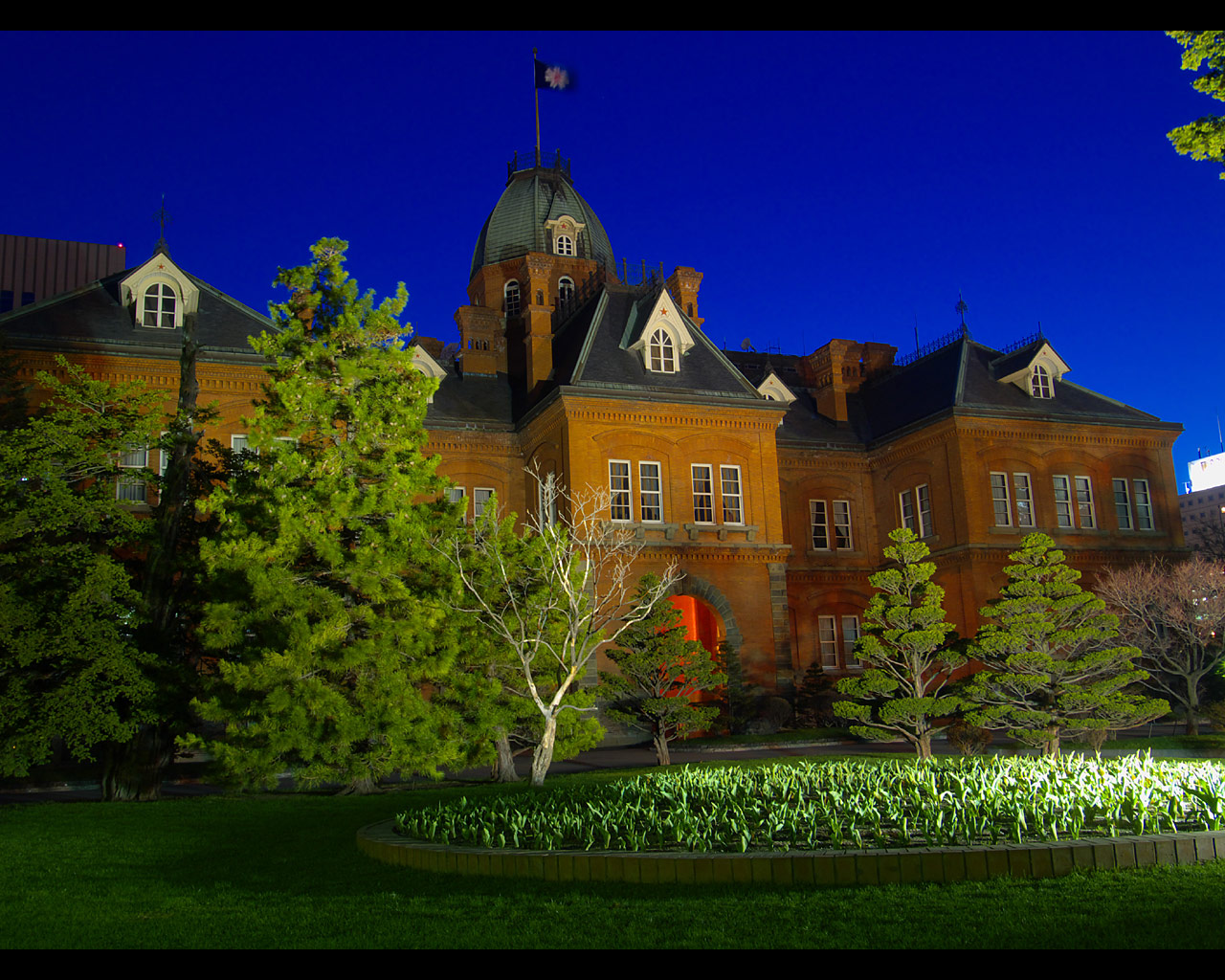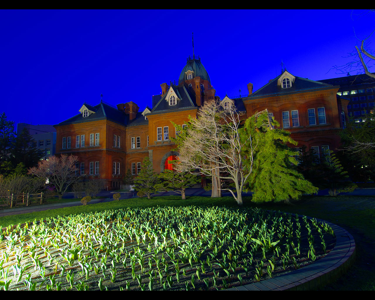 赤れんがの北海道庁は旧本庁舎で,現在は資料館や会議室として利用されています.実際の業務の大部分は裏の大きな建物で執り行われていて,赤れんが庁舎は観光名所となっています.夜景を撮るにはライトアップが大雑把なので(中央一点の光)、明暗差が大きくなってそれほど撮りやすい被写体とは言えないと思います.
