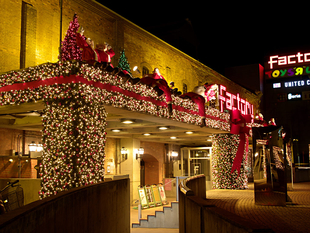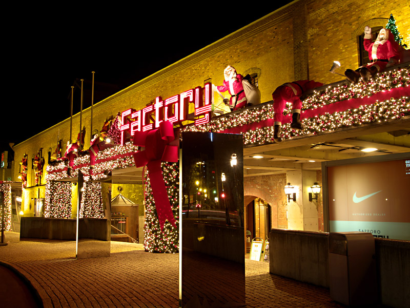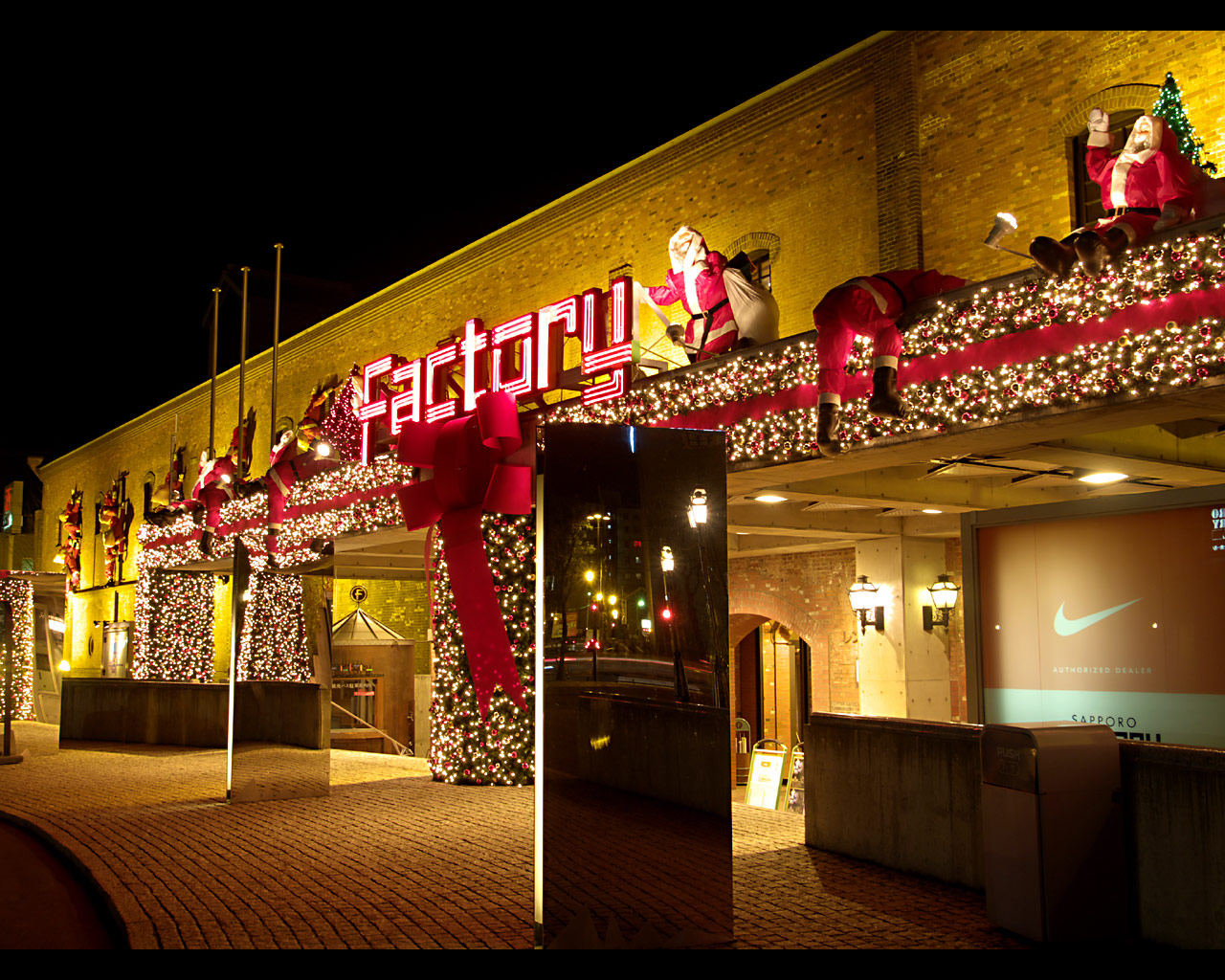 サッポロファクトリーは,サッポロビールの工場跡地に作られた複合ショッピング施設です.東京における恵比寿ガーデンプレイスと同様で,運営会社も同じです.クリスマスの時期になるとジャンボツリーやサンタクロースの装飾がなされ,クリスマス色一色になります.工場のレンガがとても雰囲気的な施設です.