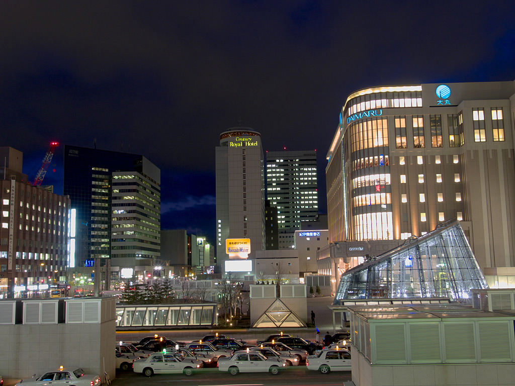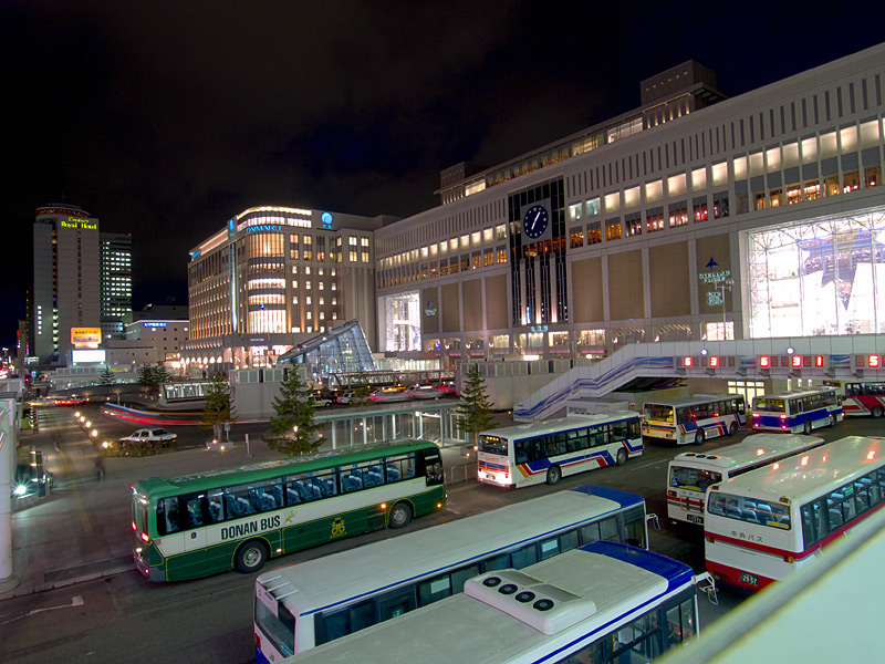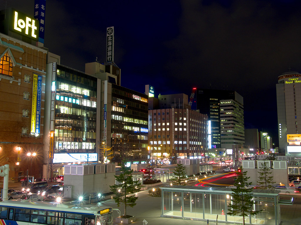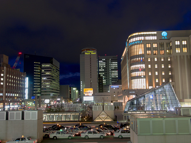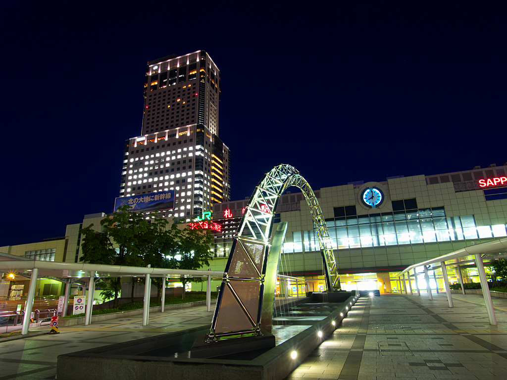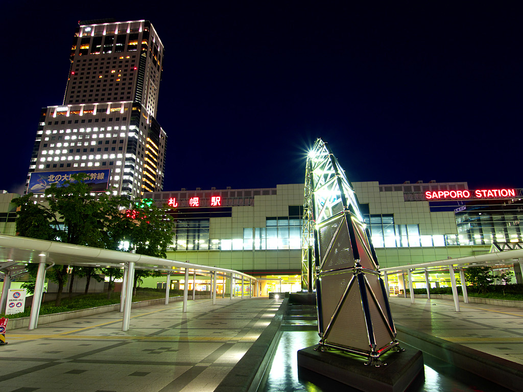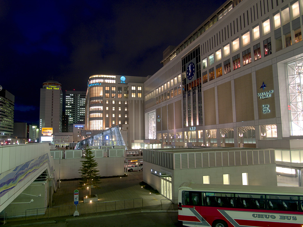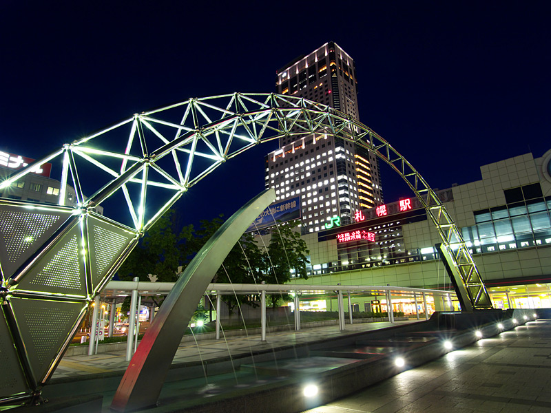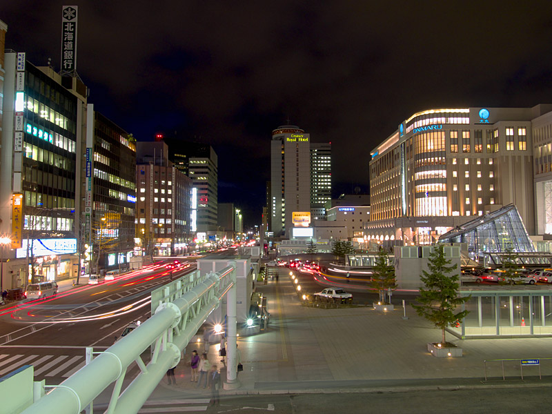 札幌駅の駅ビルとして商業施設「ステラプレイス」,高層ビル「JRタワー」,デパート「大丸」ができました.これらの施設は札幌都心の集客重心を大きく動かし,札幌駅周辺は大通公園周辺やすすきの周辺に代わって札幌の中心的な存在となりました.ただ,写真を撮る中心となる南口広場は地下を通る人が多いためか夜になるとそれほど人が歩いておらず,比較的三脚を持って写真を撮りやすい場所になっています.